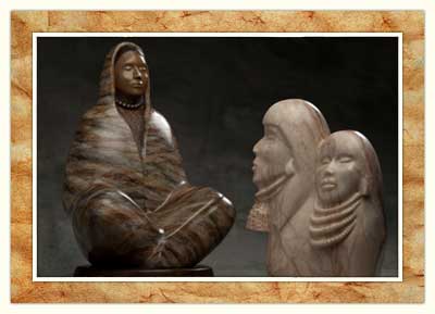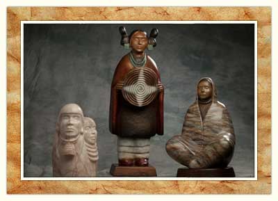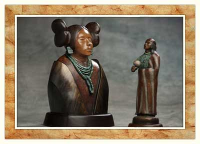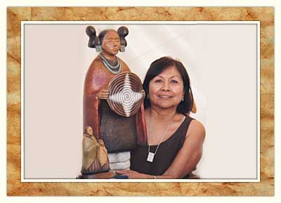 Evelyn grew up at Kykotsmovi, Arizona on the Hopi reservation. She belongs to her mother’s clan, Bamboo (Bacavi). Her father was of the Coyote Clan. Growing up in a large extended family has influenced her craft directly in the form of the images that emerge in stone and clay.