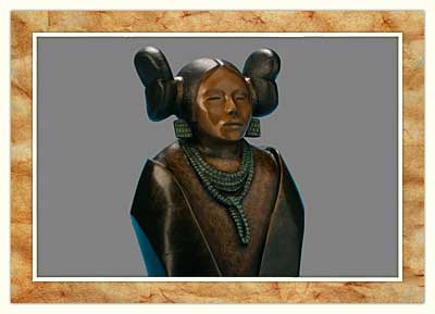 Evelyn grew up at Kykotsmovi, Arizona on the Hopi reservation. She belongs to her mother’s clan, Bamboo (Bacavi).  Her father was of the Coyote Clan. Growing up in a large extended family has influenced her craft directly in the form of the images that emerge in stone and clay.